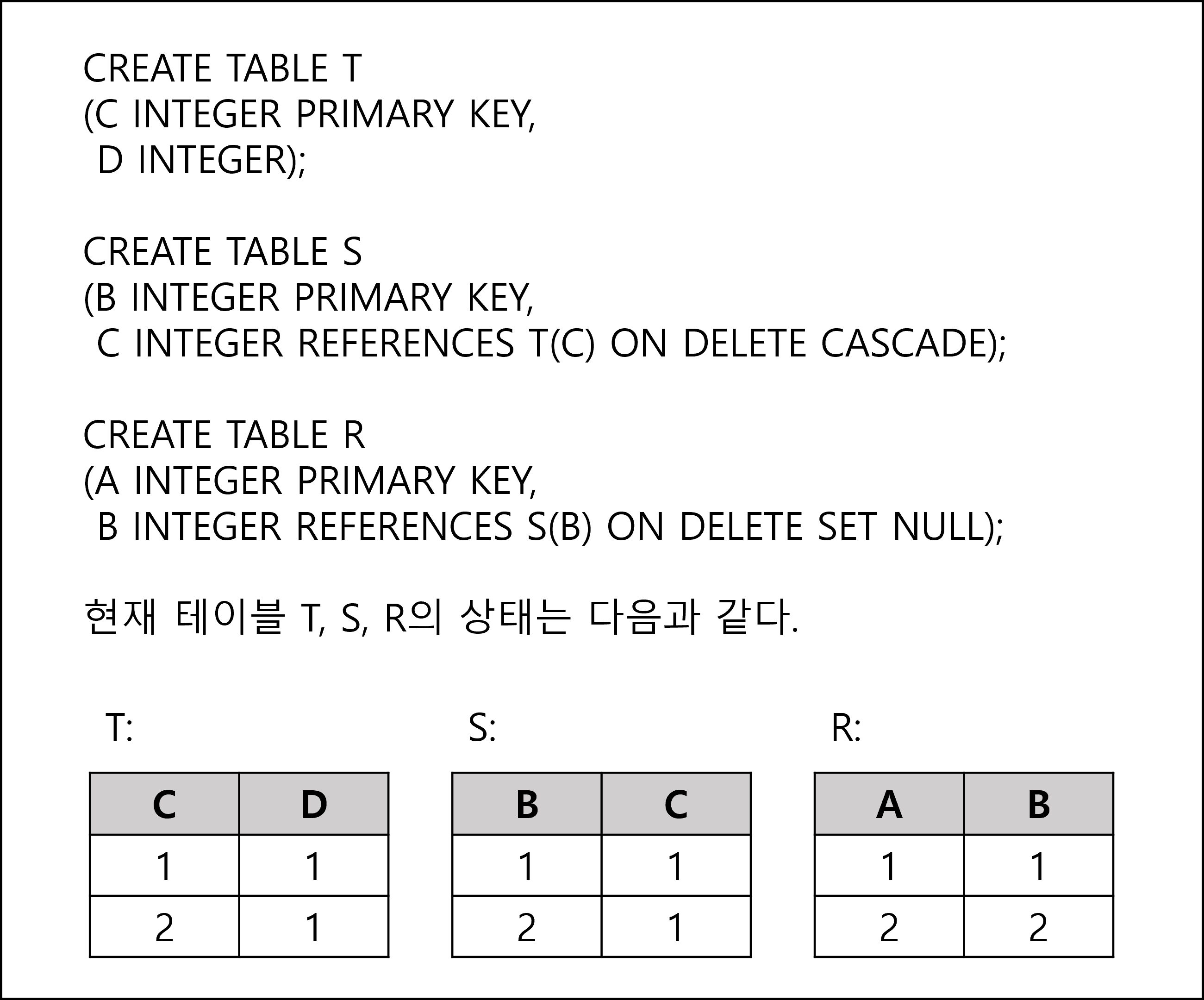 위 참고 사항을 바탕으로 문제를 풀이 해보자. 문제에서는 테이블 T를 삭제하고(DELETE FROM T;), 테이블 R에 남아 있는 값이 무엇인지 묻고 있다.