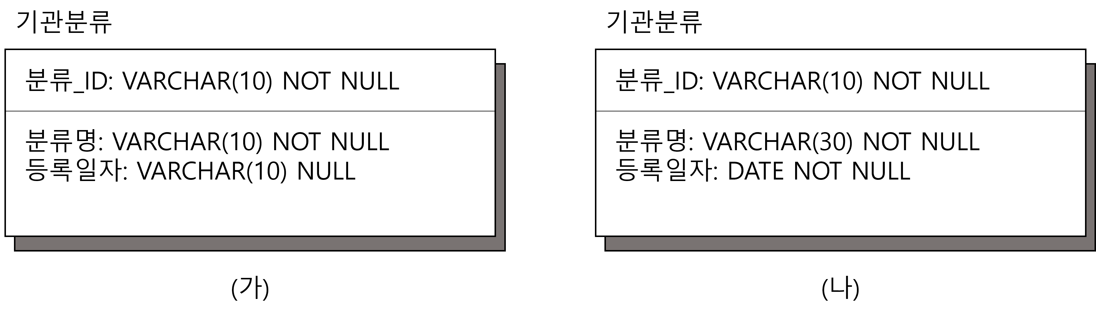 셋, (가)의 등록일자는 NULL 허용이었는데 (나)에서 NOT NULL로 바뀌었다. 즉, 기관분류 테이블에 존재하는 분류_ID, 분류명, 등록일자 컬럼은 모두 NOT NULL이 되어야 한다.
