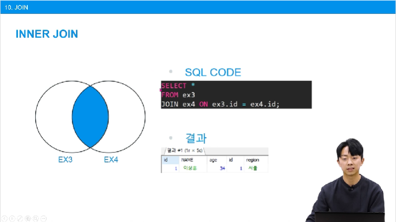 ON EX3.ID = EX4.ID;INNER JOIN은 위 그림과 같이 테이블 2개를 조인할 때 '동일한/겹치는' 값만 불러온다.위 예시에서는 EX3에도 ID라는 컬럼이 있고 EX4에도 ID라는 컬럼이 있다. 두 ID 컬럼 값이 1, 2, 3 / 1, 2, 3으로 같다면 세 행을 모두 가져온다. 만약 ID컬럼의 값들이 1, 4, 3 / 1, 2,3 이런 식으로 다르다면, 값이 같은 1과 1, 3과 3만 조인하고(연결하고) 나머지 겹치지 않는 행(4, 2)은 없어진다.
