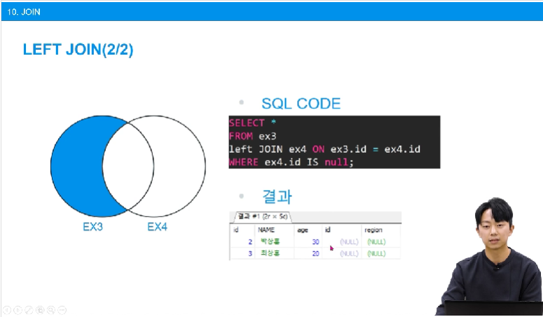 WHERE EX4.ID IS NULL;조건을 더 붙여서 겹치는 부분만 제외하는 방법도 있다. EX4.ID가 NULL인 경우란 왼쪽 테이블에는 값이 있는데 오른쪽 테이블에는 없는 경우 NULL이 나오므로 EX3 중 EX4와 겹치는 부분을 제외한 영역만 출력한다.