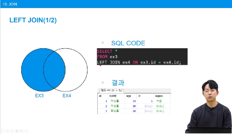 ON EX3.ID = EX4.ID;한쪽 테이블은 온전히 둔 상태로 다른 테이블 정보를 가져 오고 싶다면 OUTER JOIN을 쓰면 된다.