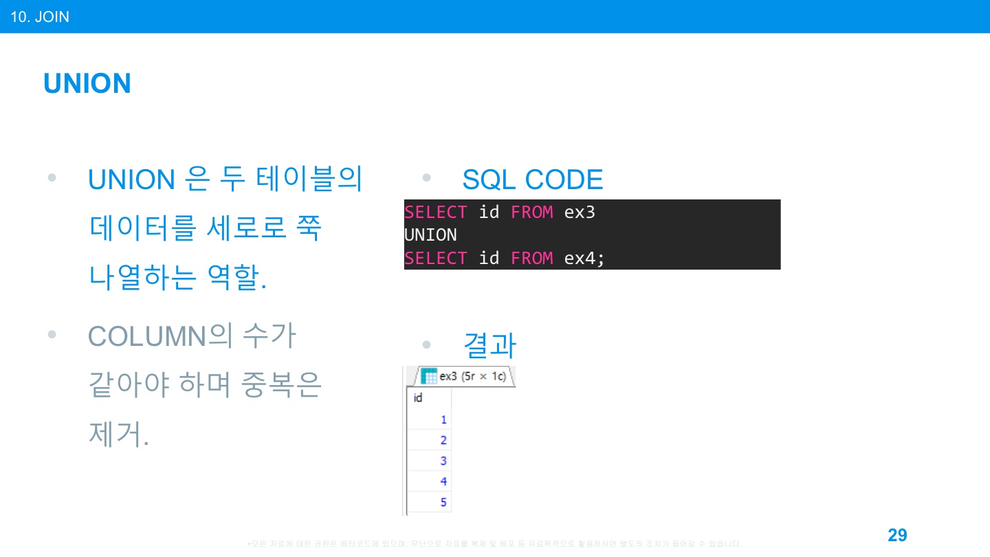 UNION은 두 테이블이 있을 때 중복 없이 표를 세로로 합친다. 여기에서 중요한 것은 합치는 컬럼의 수가 같아야 하고, 데이터 타입도 같아야 한다는 것이다. 위 예에서는 ex3과 ex4의 id를 합쳤다.