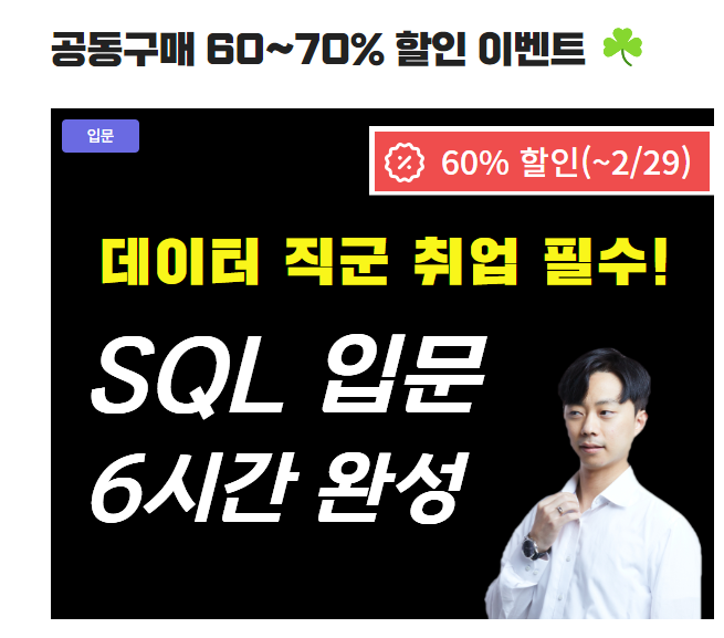 | [SQL] 데이터분석가 입문 필수 SQL 부트캠프 (4) ORDER BY, GROUP BY (0) | 2024.03.10 |