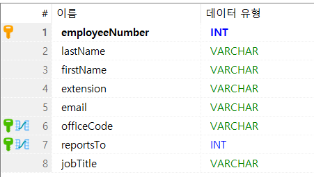 employees(직원) 테이블에는 직원번호, 이름, 성, extension, 이메일, 부서번호, 누구한테 보고하는지(직속상사), 직업타이틀 컬럼이 있다.