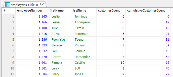 SUM(count(c.customerNumber)) OVER (ORDER BY e.employeeNumber) AS cumulativeCustomerCount