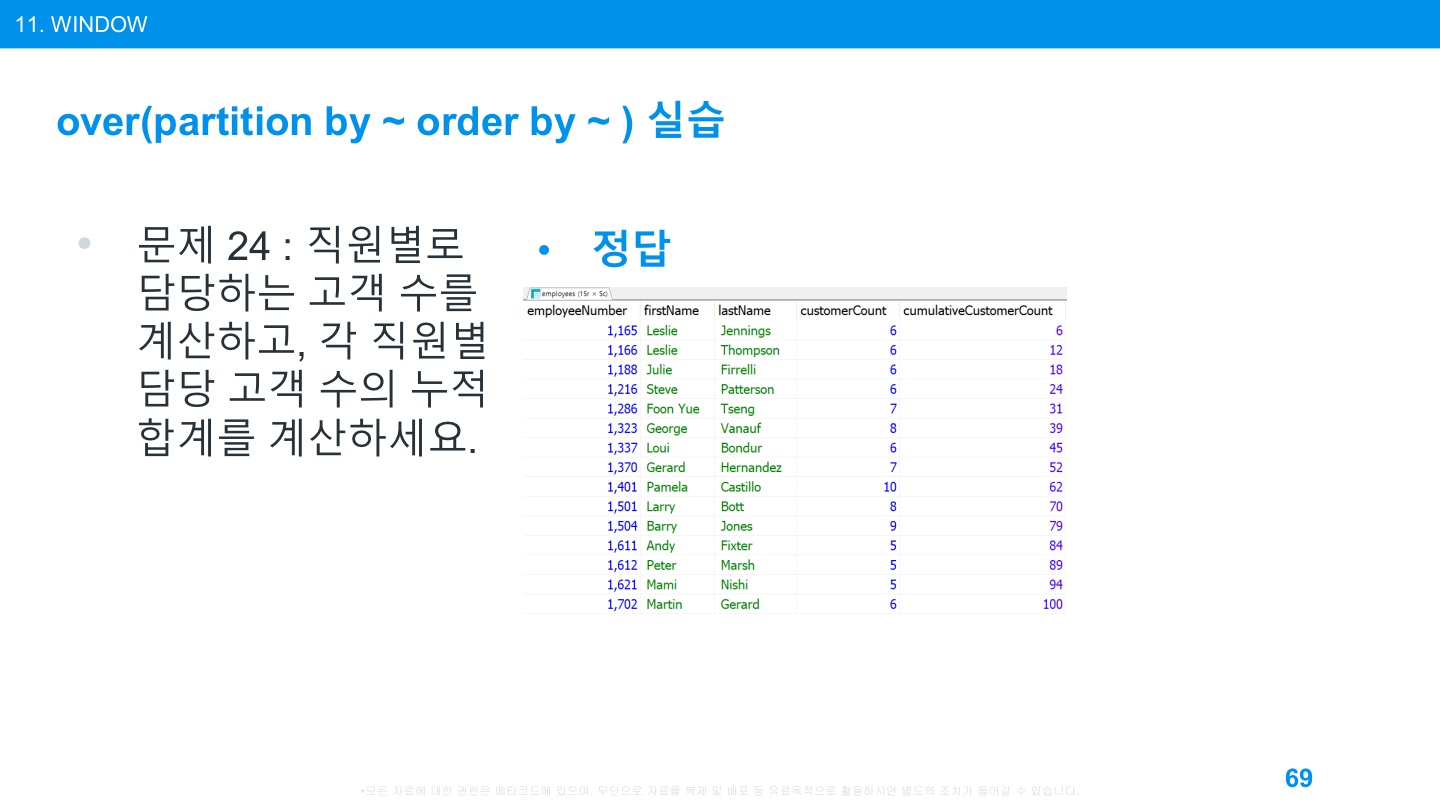 실습 문제를 풀어보면... 일단 직원별(group by? partition by?)로 담당 고객 수를 계산하고, 직원별 고객수의 누적 합계를 계산하라고 한다.