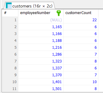 근데 '고객 수'라는 컬럼은 존재하지 않는다. 만약 SUM(customerNumber)를 하면 고객번호들이 합쳐져(고객번호 101, 102 의 합은 고객 수인 2가 아니라 203이라는 의미 없는 숫자가 됨) 이상한 숫자가 나올 것이다. 그러므로 먼저 직원별 담당 고객 수 집계를 해주어야 한다. 집계랑 관련된 것은 group by.