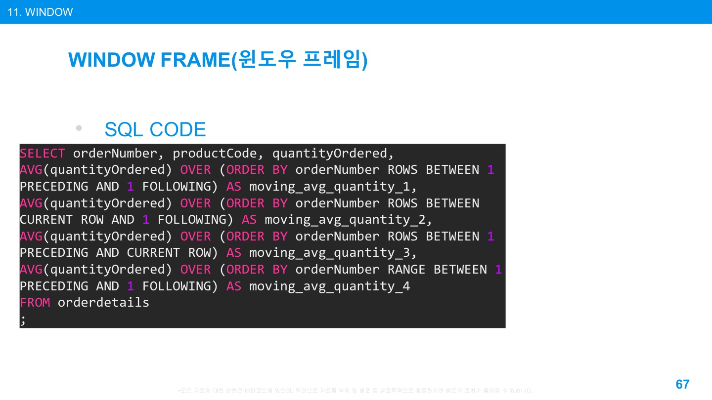 WINDOW 함수의 기본 틀을 다시 살펴보자. WINDOW 프레임은 윈도우 함수가 적용되는 조건 같은 것이다.