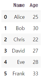 df3 = pd.DataFrame({'Name': ['Eve', 'Frank'], 'Age': [28, 33]})