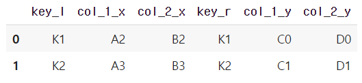 일치하는 key는 K1, K2 두 개이므로, 총 2개의 행만 가지고 와서 두 테이블을 가로로 결합한다. 아래 결과에서 일치하는 key(K1, K2)에 해당하는 부분이 가로로 합쳐진 것을 확인할 수 있다.