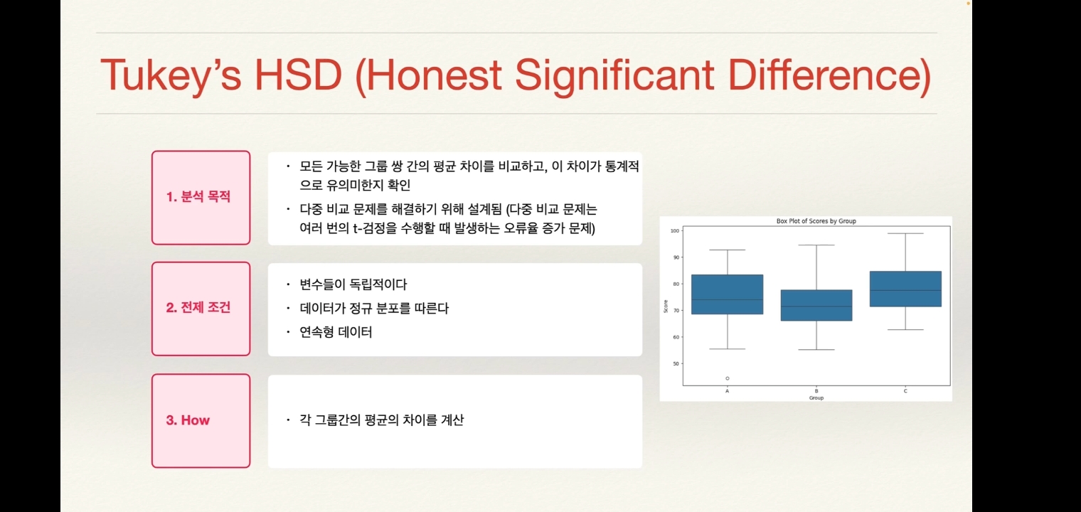 ANOVA로 세 개 이상의 집단에 적어도 하나의 평균값이 다르단 걸 밝혀내면 이후에는 Turkey 같은 사후분석을 하게 된다. 단순히 T test를 사용하면 되는 거 아닌가 싶겠지만, T-test의 신뢰도가 95%라고 했을 때 여러 번 곱해질수록 신뢰도가 낮아진다. 0.95*0.95*0.95 = 0.86으로 집단이 3개라 2쌍씩 3번만 비교해도 신뢰할 수 있는 확률이 후두둑 떨어진다.