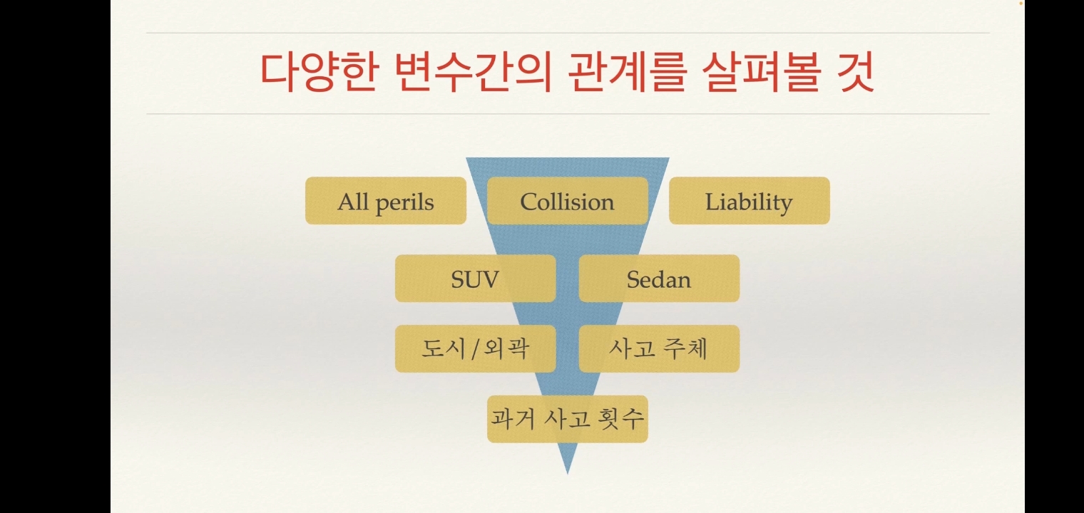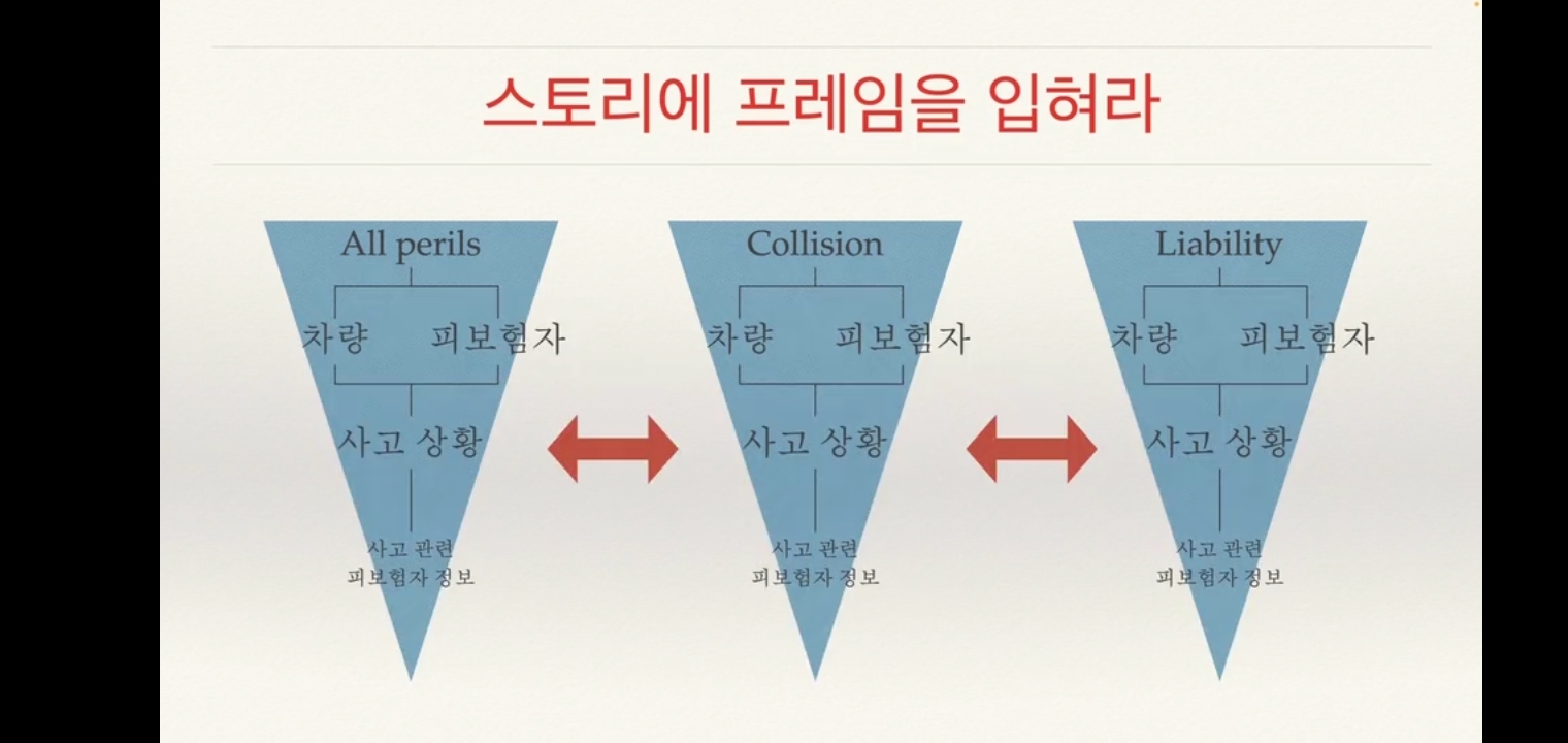 보험으로 예를 들었을 때, 보험의 종류는 크게 All perils(종합 보험 같은 것), Collision, Liability 라는 세 종류로 나뉜다. 그러면 각 보험 종류 내에서 다양한 변수들(차량 정보, 피보험자에 대한 정보 등등)끼리의 관계를 독립적으로도 살펴볼 수 있으면서, 보험 상품 별 피보험자 특징과 같이, 동일한 수준에서의 비교도 가능해야 한다. 크게 봤을 때 스토리로 엮일 수 있는 틀을 짜려면 도메인 지식이 필수적이다.