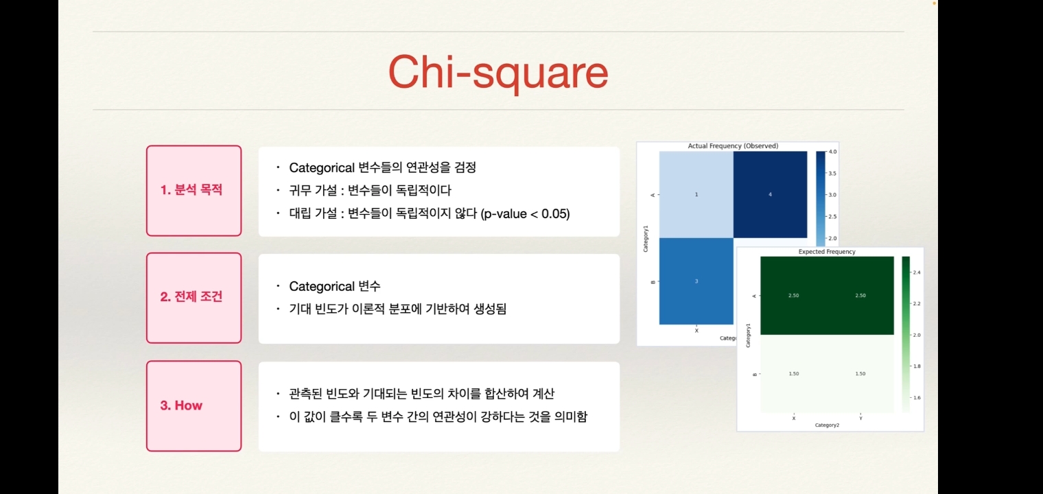 이 강의에서는 독립성 검정에 대해 소개하고 있고, 독립성 검정은 기대빈도와 실제빈도를 비교해 변수간의 연관성(연관성이 없다면 독립성)을 조사한다.