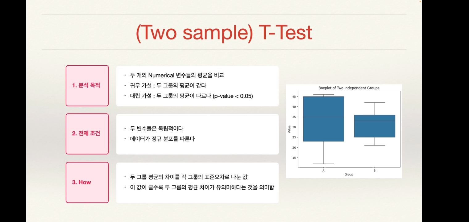 T-Test야 뭐, 간단하게 말하면 두 집단의 평균을 비교하는 분석이고 대응표본 t, 독립표본 t가 있는데 여기서 설명하신 건 독립표본에 가까운 것 같다. 전-후 차이보단 두 그룹의 차이를 분석하는 거라...!