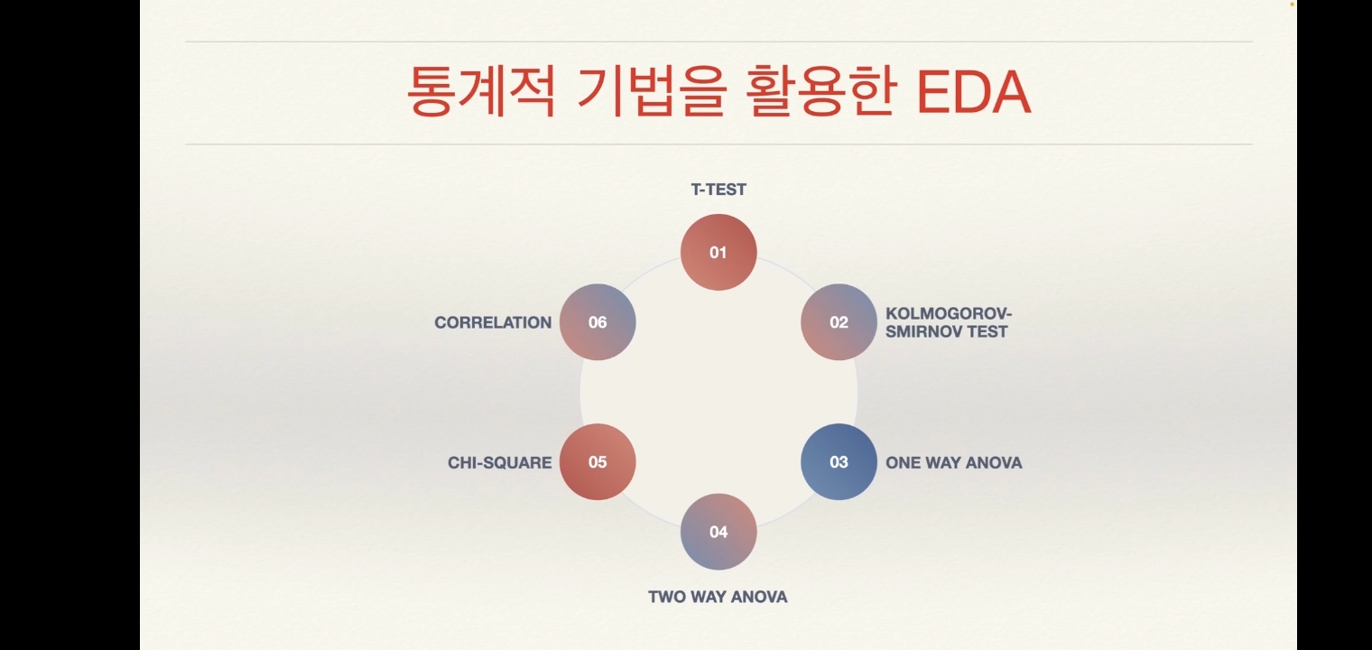 통계적 기법을 활용한 EDA(탐색적 데이터 분석) 라고 소개를 하셨는데, 내 생각에는 가설을 설정하고 검정하는 통계분석에 가깝지 않을까 생각한다.