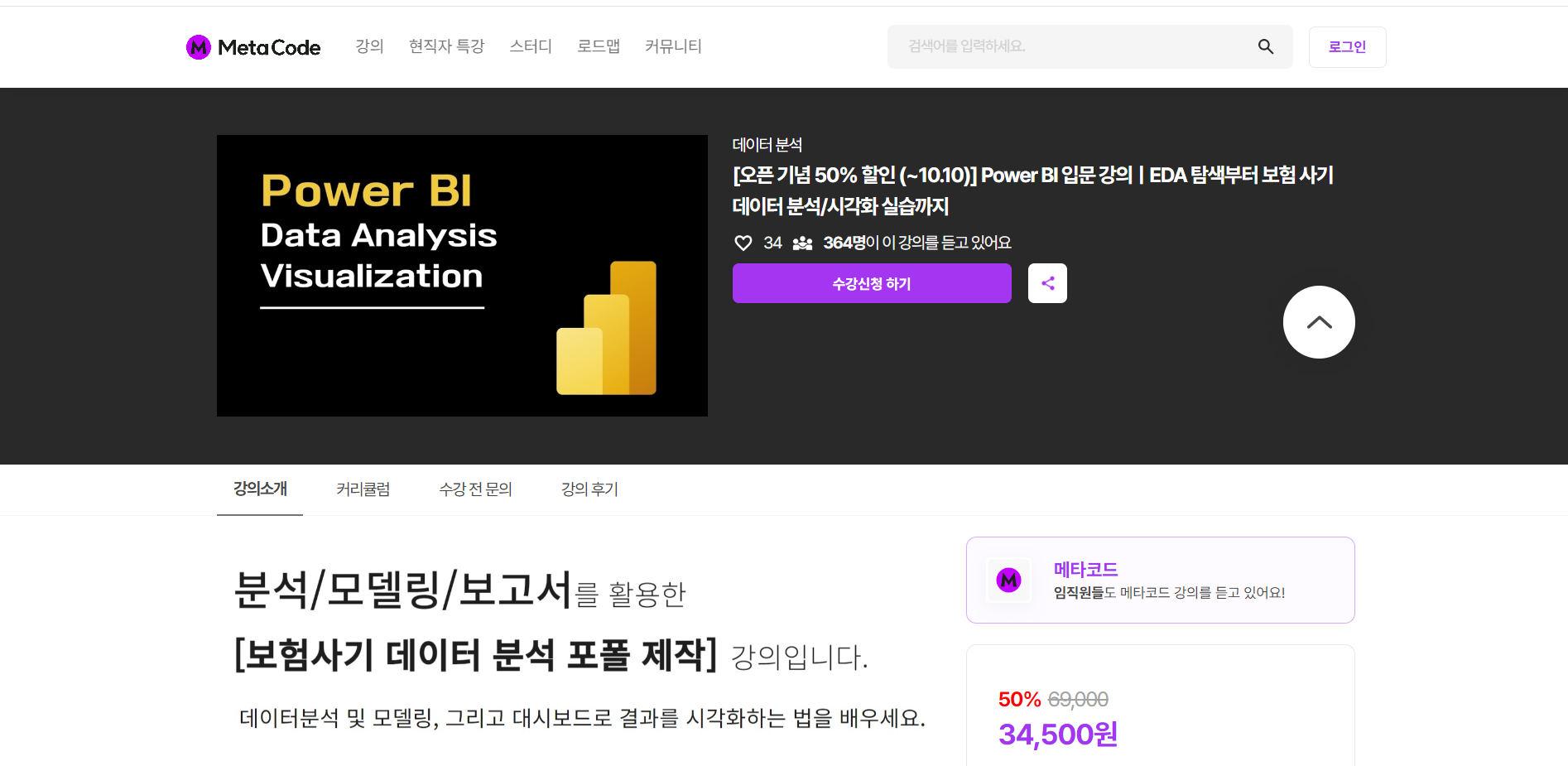 * 강의는 메타코드 사이트에서 들을 수 있다. 나는 메타코드 서포터즈로서 강의를 제공받아 글을 작성하고 있다. 물론 이번 powerBI 강의는 무료로 풀렸을 때 들은 거라 강의 쿠폰을 사용한 건 아니지만 ^^;... 뭐 어쨌든. 홈페이지 이미지를 클릭하면 홈페이지로 이동한다.