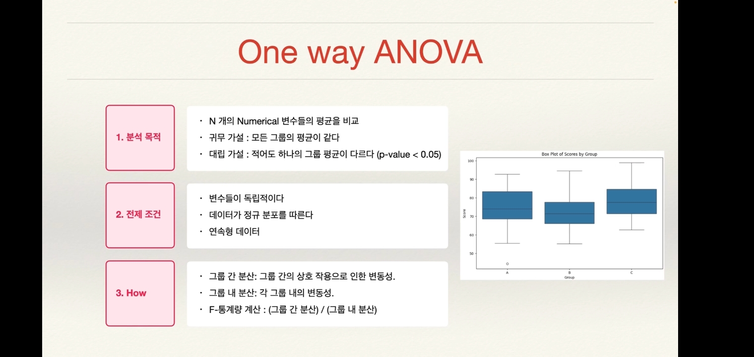 주로 one way, two way 이런 식으로 ANOVA를 많이 사용하는데, ANOVA 또한 집단의 평균을 비교하는 분석방법이다. 다만 집단이 3개 이상일 때 주로 사용되고, 변수의 개수에 따라 one way, two way 로 나뉜다. 가설은 적어도 한 개 집단의 평균이 다른 그룹 평균과 다를 것이다(H1). 라고 설정한다.
