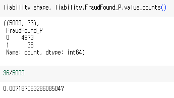 Liability인데 보험사기인 경우는 36건 뿐이다. 눈으로 보기에도 확연하게 너무 적은 것을 볼 수 있다.