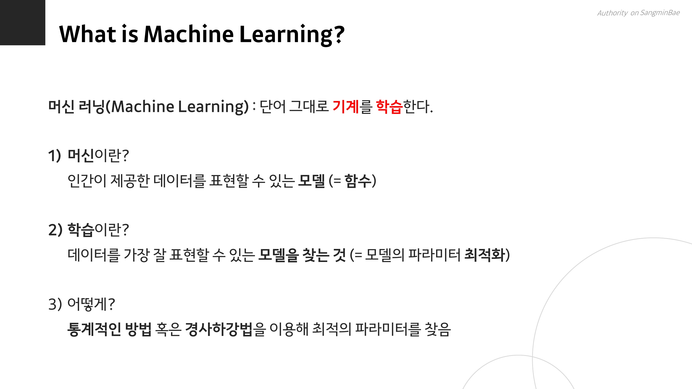 머신러닝에서 학습이라는 것은, 주어진 데이터를 가장 잘 표현할 수 있는 모델(=함수)을 찾는 것이다. 이를 위해 통계적 기법이나 경사하강법 등을 사용해 최적의 파라미터를 찾는다.