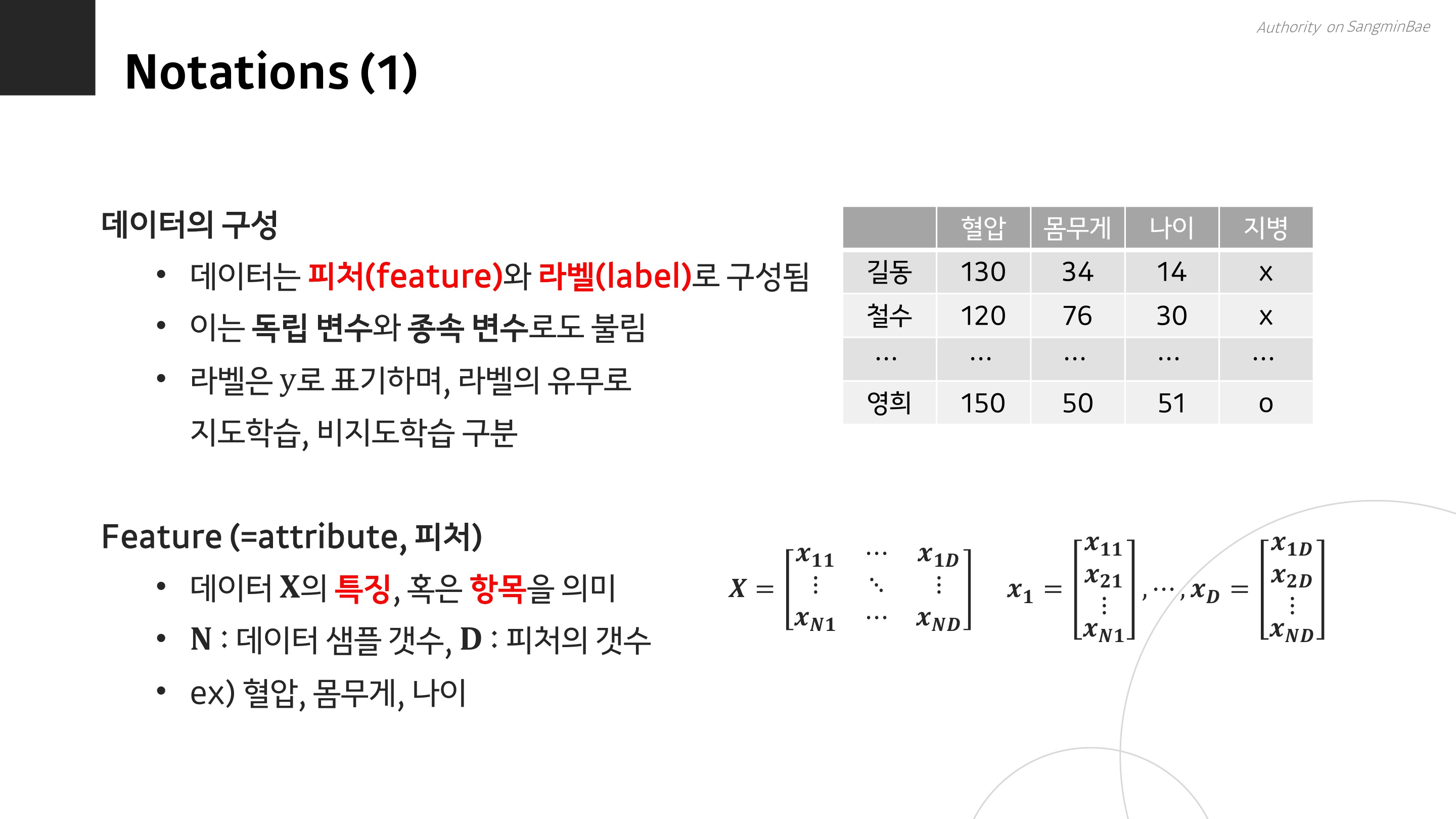 데이터는 피처와 라벨로 구성된다. 피처(feature)는 독립변수라고도 불리고, x로 표시한다. 라벨(label)은 모델이 예측하고 싶은 변수로, 종속변수라고도 불리며, y로 표기한다.