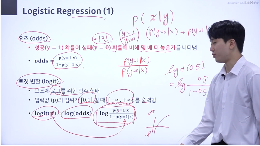 logit(0.5) = log(0.5/(1-0.5)) = log 1 하면 원래 odds는 0~1 사이의 범위만 나왔다면 이를 log로 했을 땐 마이너스 무한대부터 무한대까지로 표현된다! 넘나 신기