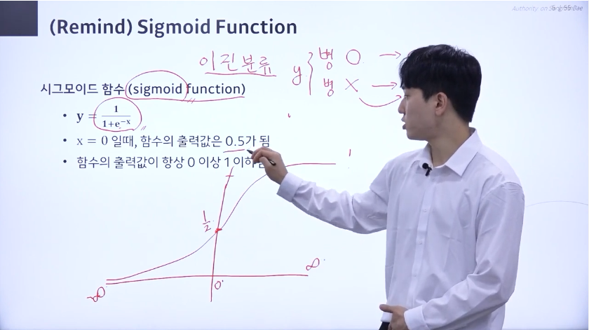 시그모이드 함수는 지수 함수의 분수 형태이다. 마이너스 무한대로 갈수록 0에 가까워지고, 무한대로 갈수록 1에 가까워지는 함수이다. 그리고 x = 0일 때 출력값은 1/2임!