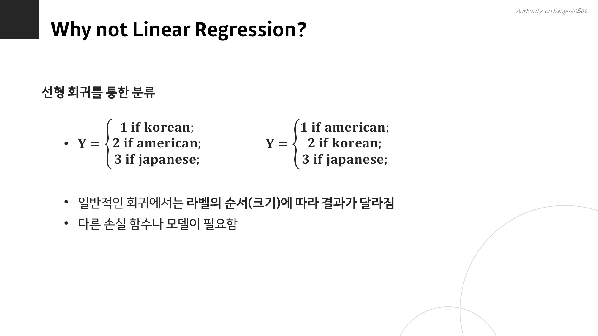 선형 회귀분석으로는 분류를 할 수 없을까? Korea = 1, american = 2, japanese = 3 이런 식으로 수치형(연속형) 변수를 부여하게 되면 숫자에 따라 결과가 달라진다.